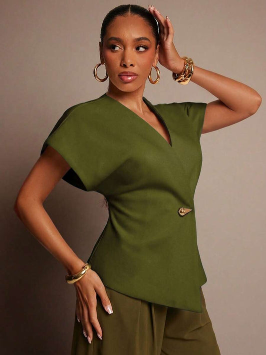Vixey Solid Textured Woven Asymmetrical Hem Single Button Waistcoat Top