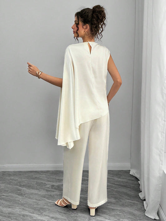 Momance Elegant Solid Color Maternity 2 Pieces Set - Satin Asymmetrical Hem Blouse With Straight Leg Pants, Sophisticated