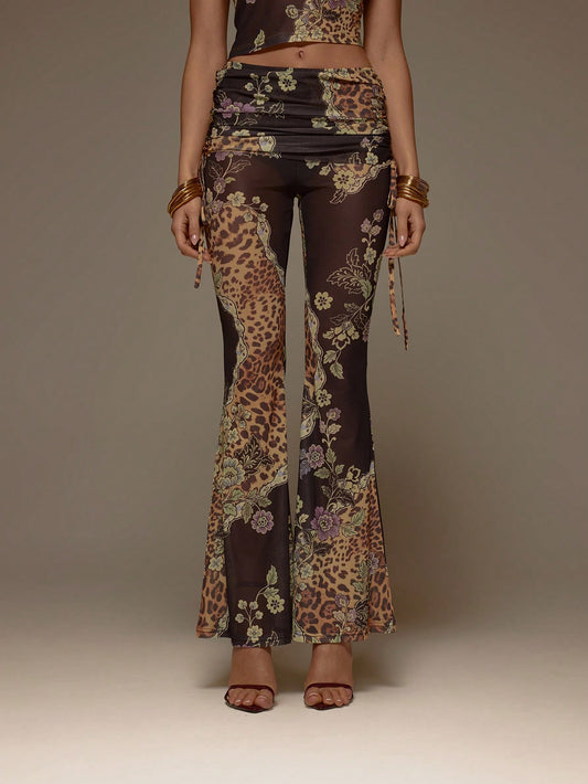 MUSERA Floral Animal Print Power Mesh Foldover Tie Side Fitted Flared Trousers