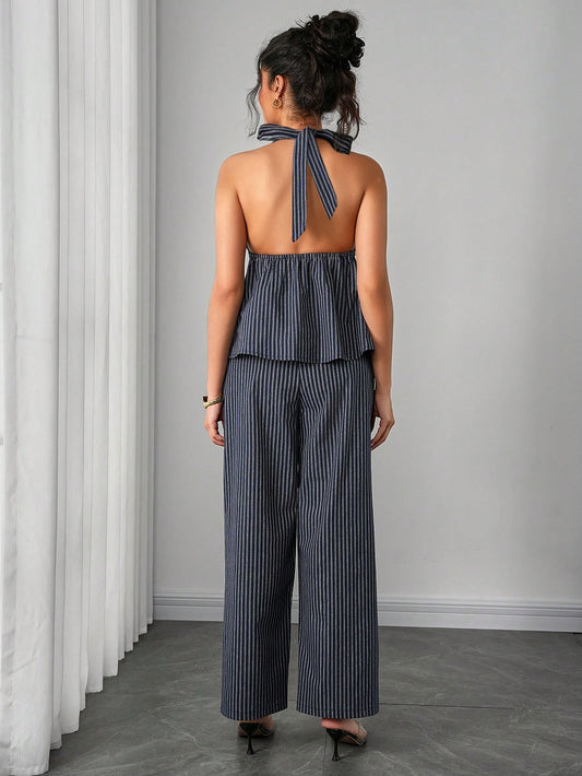 Momance 2pcs Maternity Set: Halter Tie Back Bow Decor A-Line Shirred Top Striped Straight Leg Pants