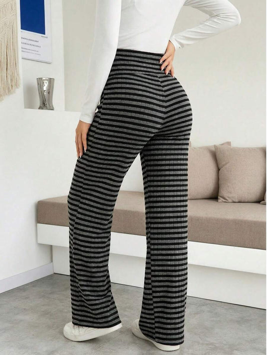 Maternity Plus Size High Waisted Black And White Striped Ribbed Knitted Wide Leg Long Dress Pants Trousers With High Stretch Stretchy Tummy Control, Comfy Comfortable For Casual Work Daily Wear