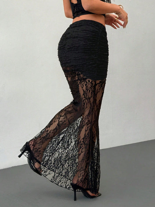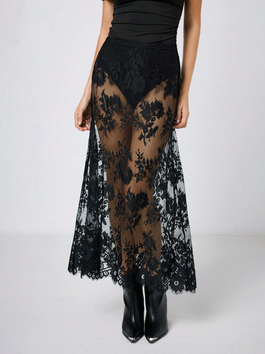 Tall Women's Elegant Romantic Fashion Commute Sexy Black Lace Maxi Skirt