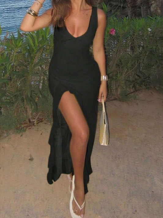 Women's V-Neck Ruffle Hem Dress, Sexy Cream Yellow Dress, High Slit Dress, Autumn Dress, Country Music Festival Outfit, Elegant Dress For Women