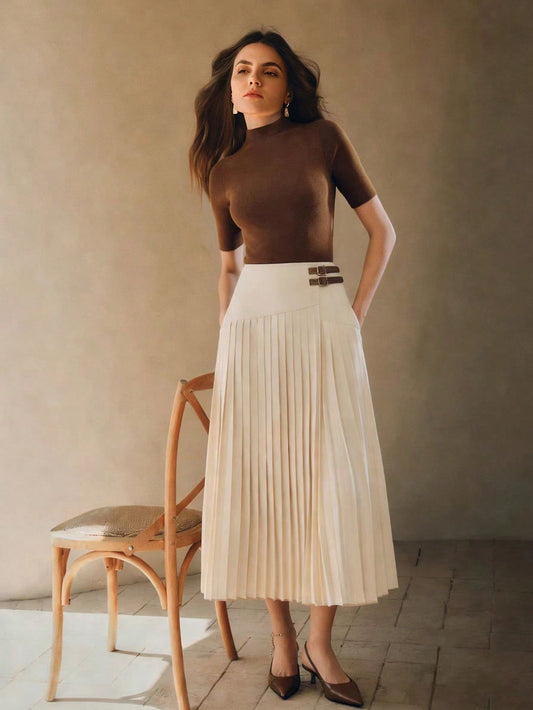 Anewsta Apricot Pleated Contrast Color Elegant Everyday Casual Commute Versatile Women Skirt