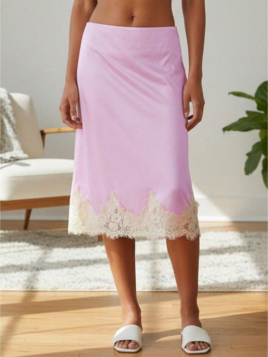 NOVVYNE Women's Solid Color High Waist Contrast Lace Elegant Skirt