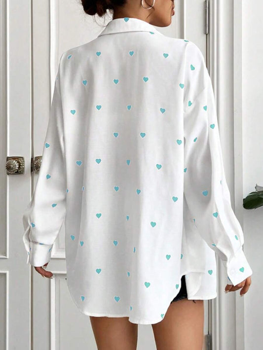 Women's Front Button Long Sleeve Pocket Heart All Over Print Casual Shirt