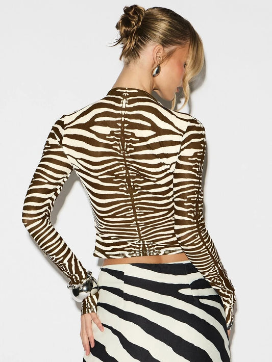 KIZN Zebra Print Long Sleeve Mesh Top Animal Pattern Fitted Crew Neck Fashion Blouse With Transparent Overlay Style