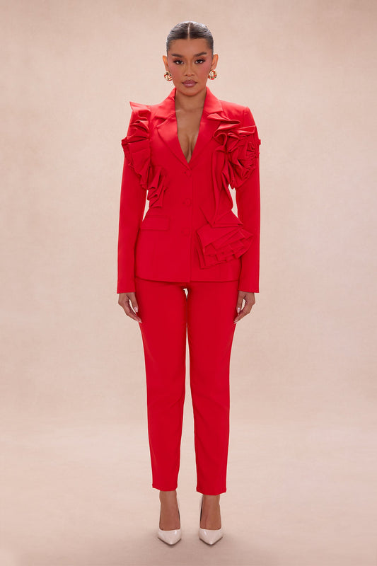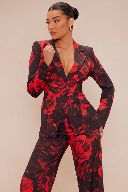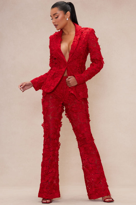Crimson Touch Jacquard Blazer Pant Set - Red/Black