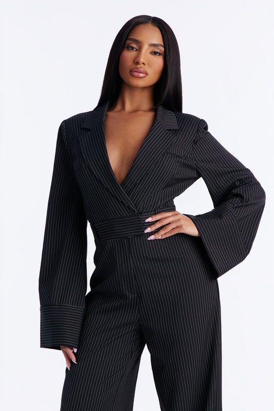 Kylie Blazer Pinstripe Wide Leg Jumpsuit - Black