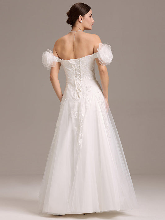 Off Shoulder A Line Short Sleeves Floor-Length Wedding Dress with See-through Detail