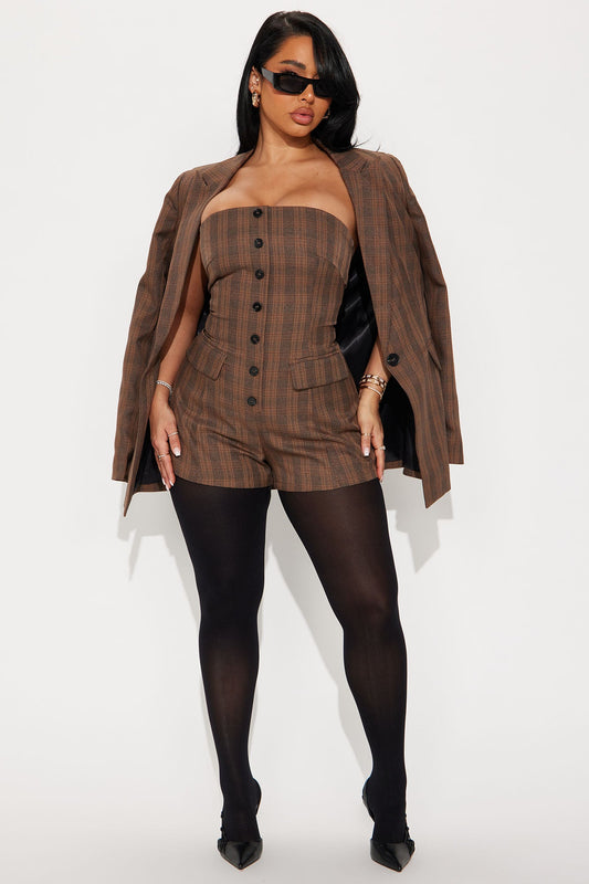 Check The Fax Blazer Romper Set - Brown/combo