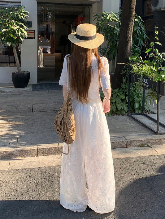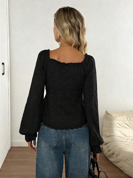 Easowa Square Collar, Frill Trim, Puff Sleeve, Lace Patchwork, Waist Cinched A-Line Blouse, Embroidery, Jacquard Texture Fabric, Casual Relaxed Elegant Office Lady Style Women Blouse Casual For Women Autumn For Women White Top