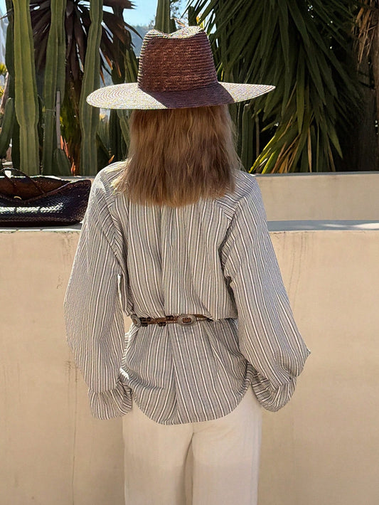 Livesso Striped Loose Exclusive Spring Waist Belt Shirt For Women