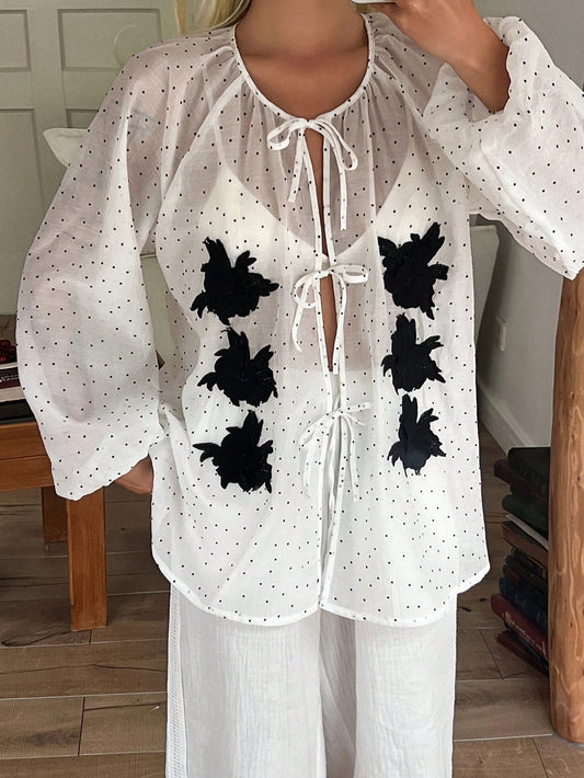 Livesso Polka Dot Allover Print Sheer Blouse With Front Tie Bow Design, Casual, Beach, Music Festival, Valentine's Day, Wedding, Spring/Summer