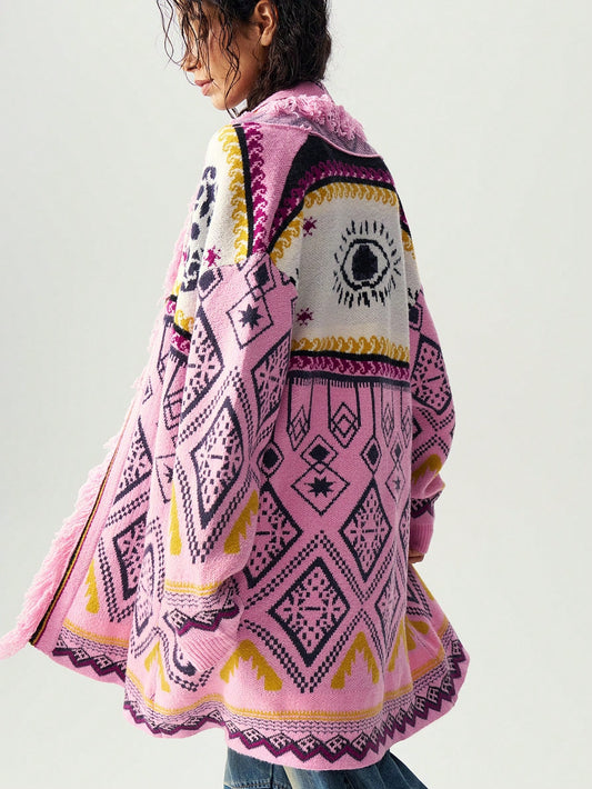 Bohemela Women's Loose Geometric Pattern Fringe Trim Cardigan For Fall/Winter, Holiday, Long Sleeve Tops