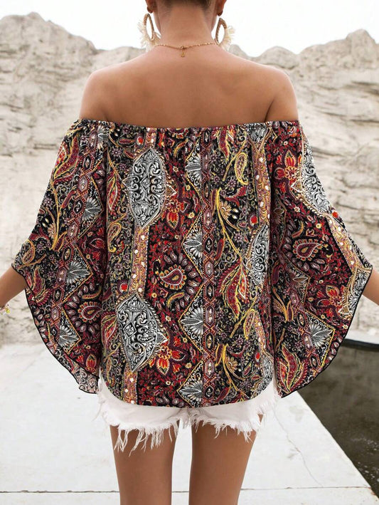 Breezaya Paisley Print Off Shoulder Trumpet Sleeve Blouse