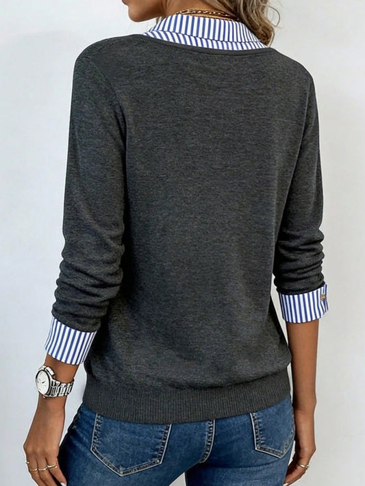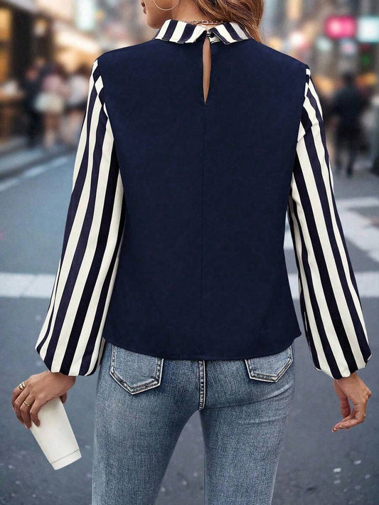 EMERY ROSE Women's Striped Patchwork Shirt Collar Long Sleeve Casual Blouse