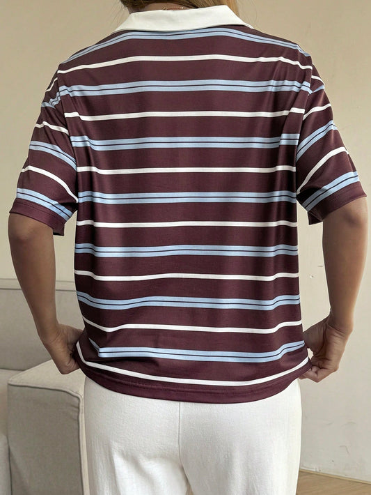 EMERY ROSE Striped Print Notch Collar Casual Versatile Short Sleeve Shirt