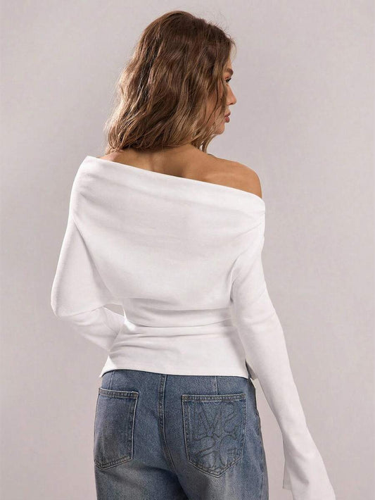 BAE Women's Solid Color Cashmere White Warm Asymmetric Neckline Metal-Decorated Collar Pleated Casual Long-Sleeve T-Shirt
