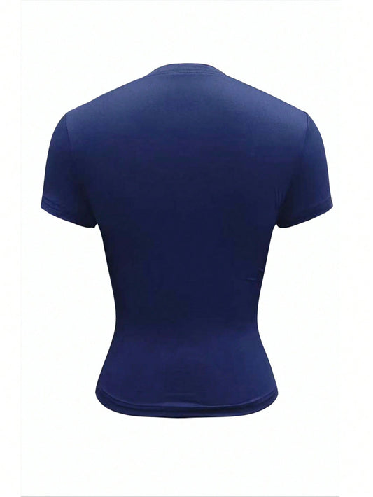 EZwear Women Navy Letter Button Placket Short Sleeve Casual Cropped T-Shirt, Minimalist Design Blue Top