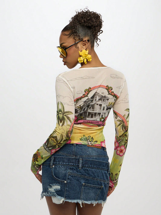 SUMWON Women Hawaiian Scene Print Long Sleeve Mesh Button Down Shirt Floral Hibiscus Beach House Summer Resort Holiday Palm Collection Light Breezy Tropical Island Top