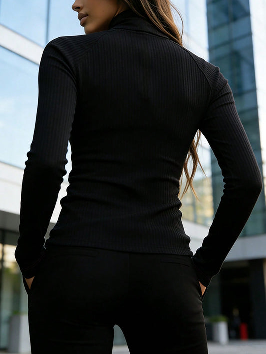 EMERY ROSE Women's Solid Color Long Sleeve Zip-Up Half Placket Ribbed Slim Fit Casual T-Shirt