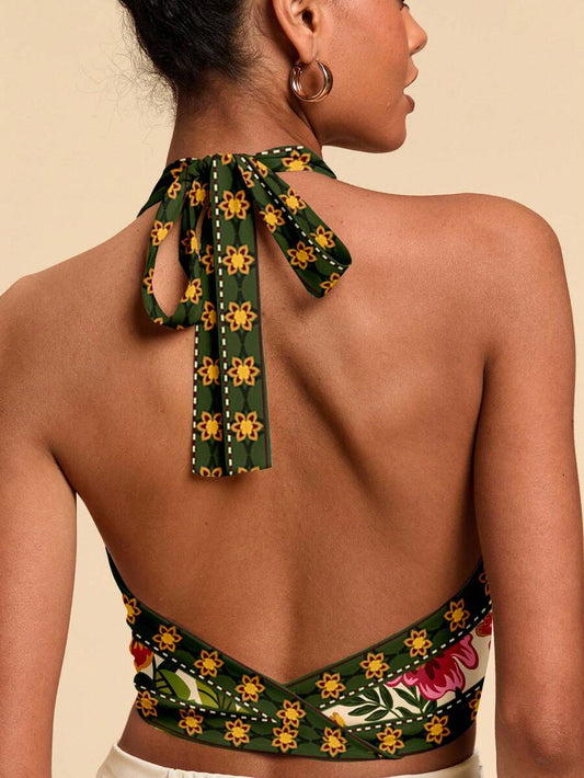 Travachic Women Floral Print Halter Neck Backless Casual Top